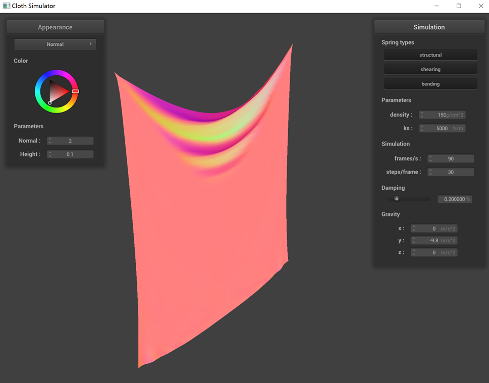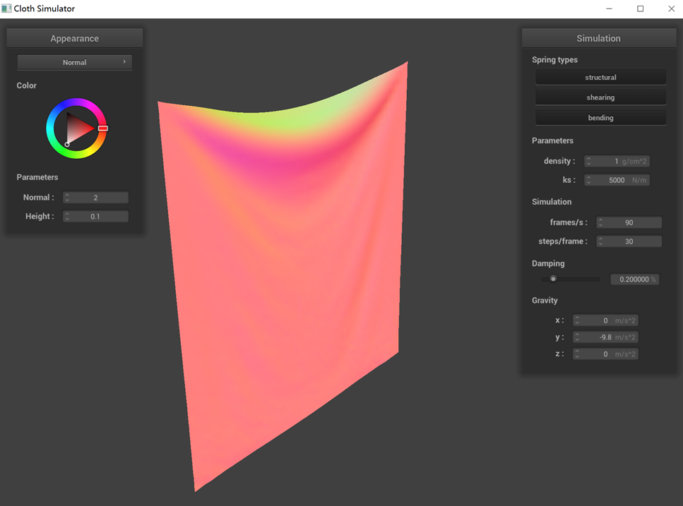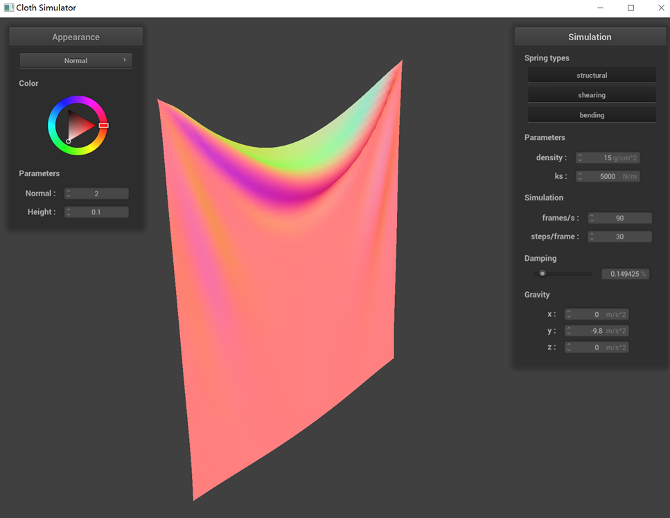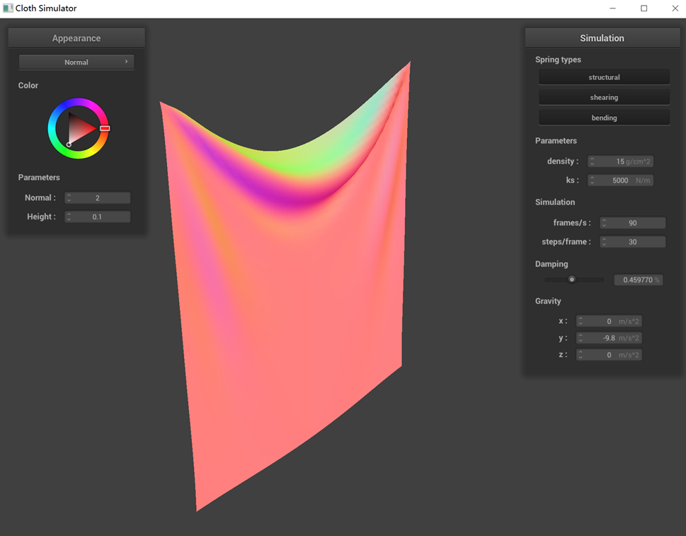 The performance of a pinned cloth simulation under various parameters (ks, density, damping) is demonstrated